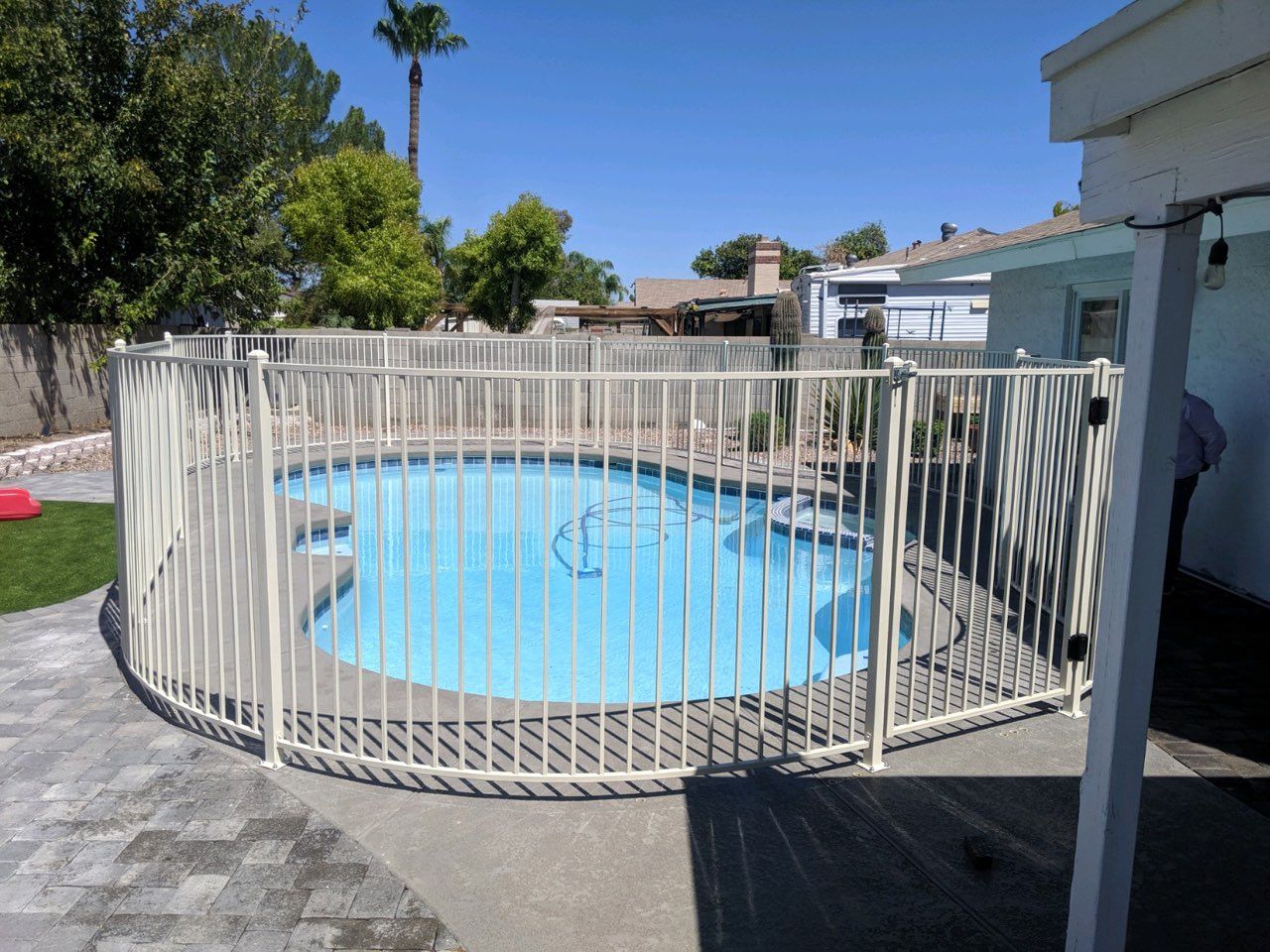 We provide security to your pool area with the installation of different styles and materials to your liking. Our work follows the required security codes. Our pool fence feature self-closing hinges and latches at required heights, with keypad, or key lock.